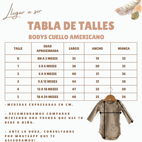El cuello americano facilita el momento de vestir y desvestir, permitiendo colocar el body cómodamente tanto desde la cabeza como desde los pies. El broche pañalero aporta practicidad y comodidad al momento del cambio.